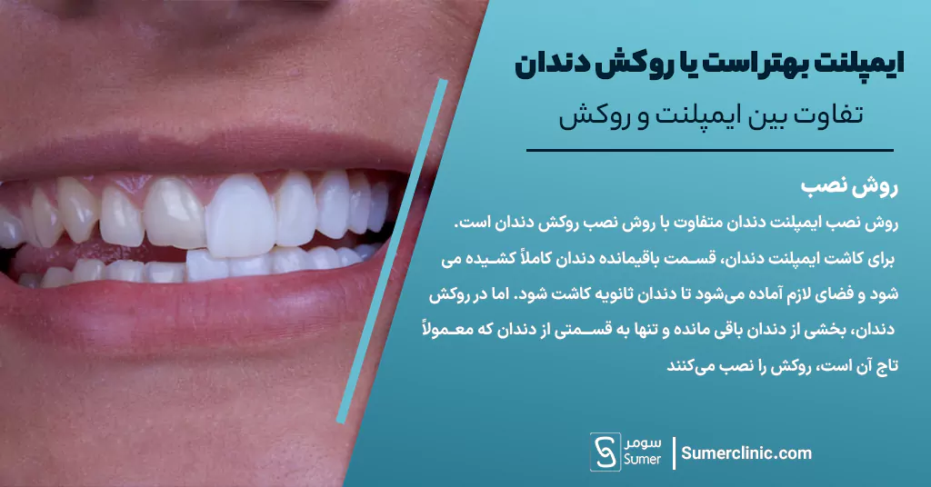 روش نصب ایمپلنت دندان متفاوت با روش نصب روکش دندان است. برای کاشت ایمپلنت دندان، قسمت باقیمانده دندان کاملاً کشیده می‌شود و فضای لازم آماده می‌شود تا دندان ثانویه کاشت شود. اما در روکش دندان، بخشی از دندان باقی مانده و تنها به قسمتی از دندان که معمولاً تاج آن است، روکش را نصب می‌کنند.