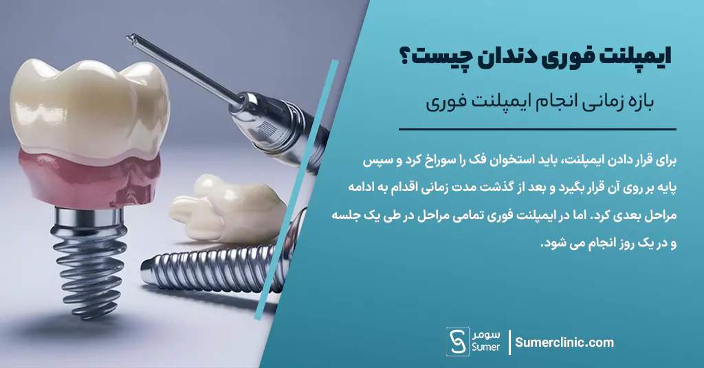 برای قرار دادن ایمپلنت، باید استخوان فک را سوراخ کرد و سپس پایه بر روی آن قرار بگیرد و بعد از گذشت مدت زمانی اقدام به ادامه مراحل بعدی کرد. اما در ایمپلنت فوری تمامی مراحل در طی یک جلسه و در یک روز انجام می شود.